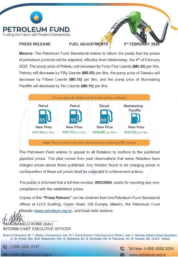 According to the Secretariat, the pump price of Petrol 93 has been reduced by 45 lisente per litre, while Petrol 95 has decreased by 50 lisente per litre. Diesel 50 has been adjusted downward by 15 lisente per litre, and the price of illuminating paraffin has dropped by 10 lisente per litre.